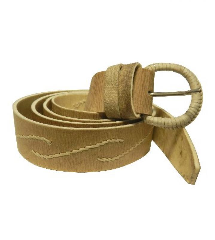 Cinto Fino De Cuero Crudo Bordado En Centro Con Hebilla Forrada En Tiento