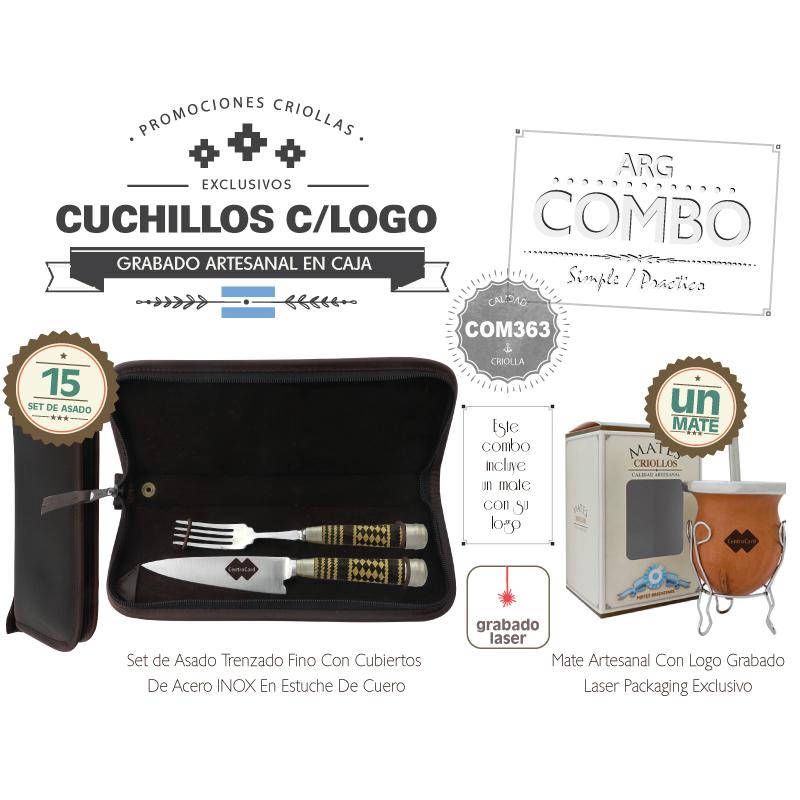 Combo Exclusivo Artesanal De 15 Set De Asado Cuchillo y Tenedor Trenzado Fino, Hoja Acero Inox. 14 Cm En Estuche De Cuero Grabado Incluye Un Mate Bocon De Calabaza Forrado En Cuero Grabado Con Bombilla y Caja De Regalo