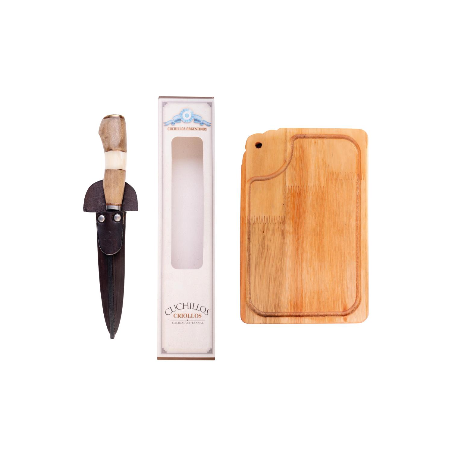 Combo Asador Del Interior (1 Cuchillo Regional Inox 14cm Con Vaina Cuero Grabado con Caja, 1 Tabla Colonial Individual Grabada 30×19)