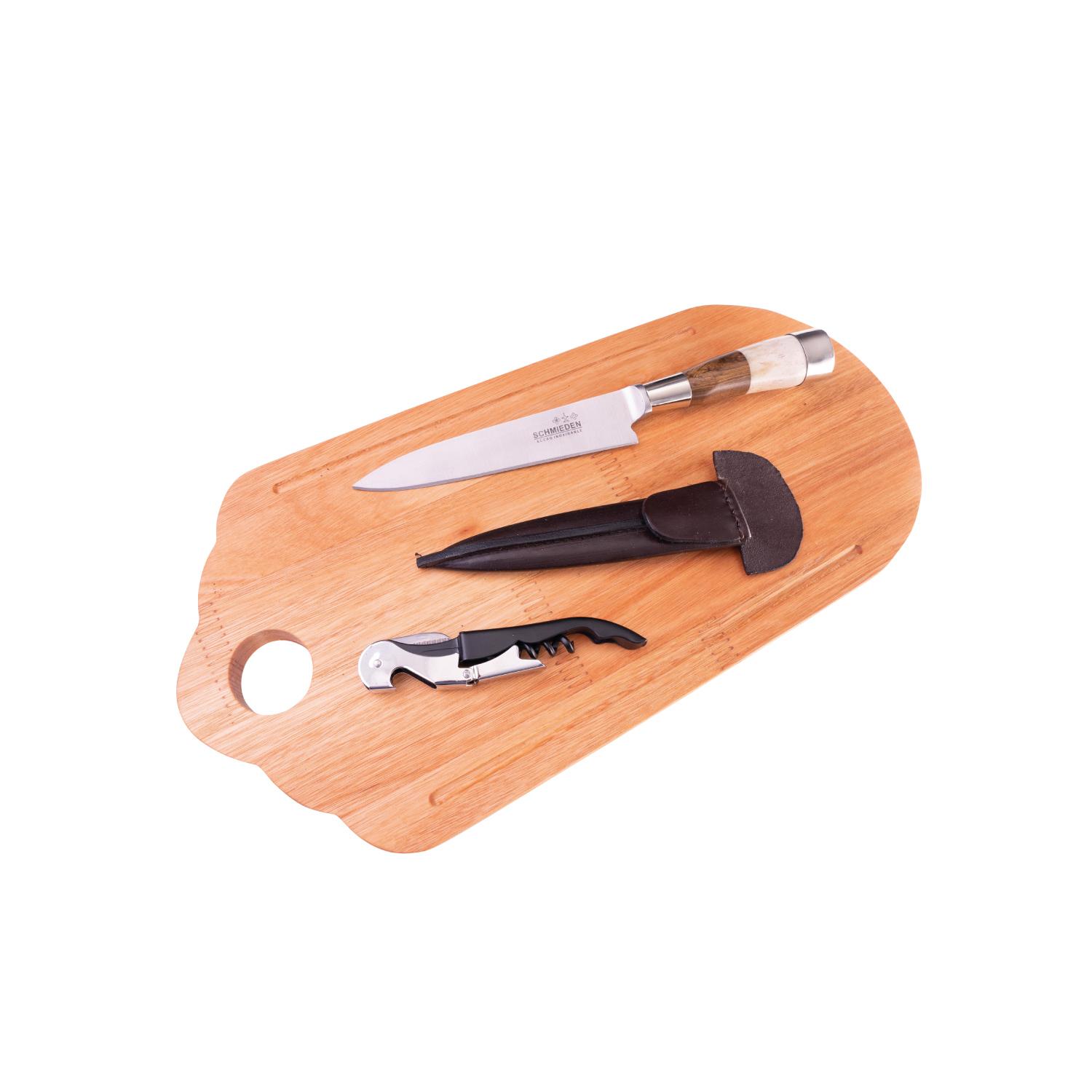 Combo Asador Y Destapador (1 Destapador Clasico, 1 Cuchillo Madera,Ciervo,Alpaca 14 Cm Acero Inox. Vaina Cuero, 1 Tabla Estilo Colonial 42×18)