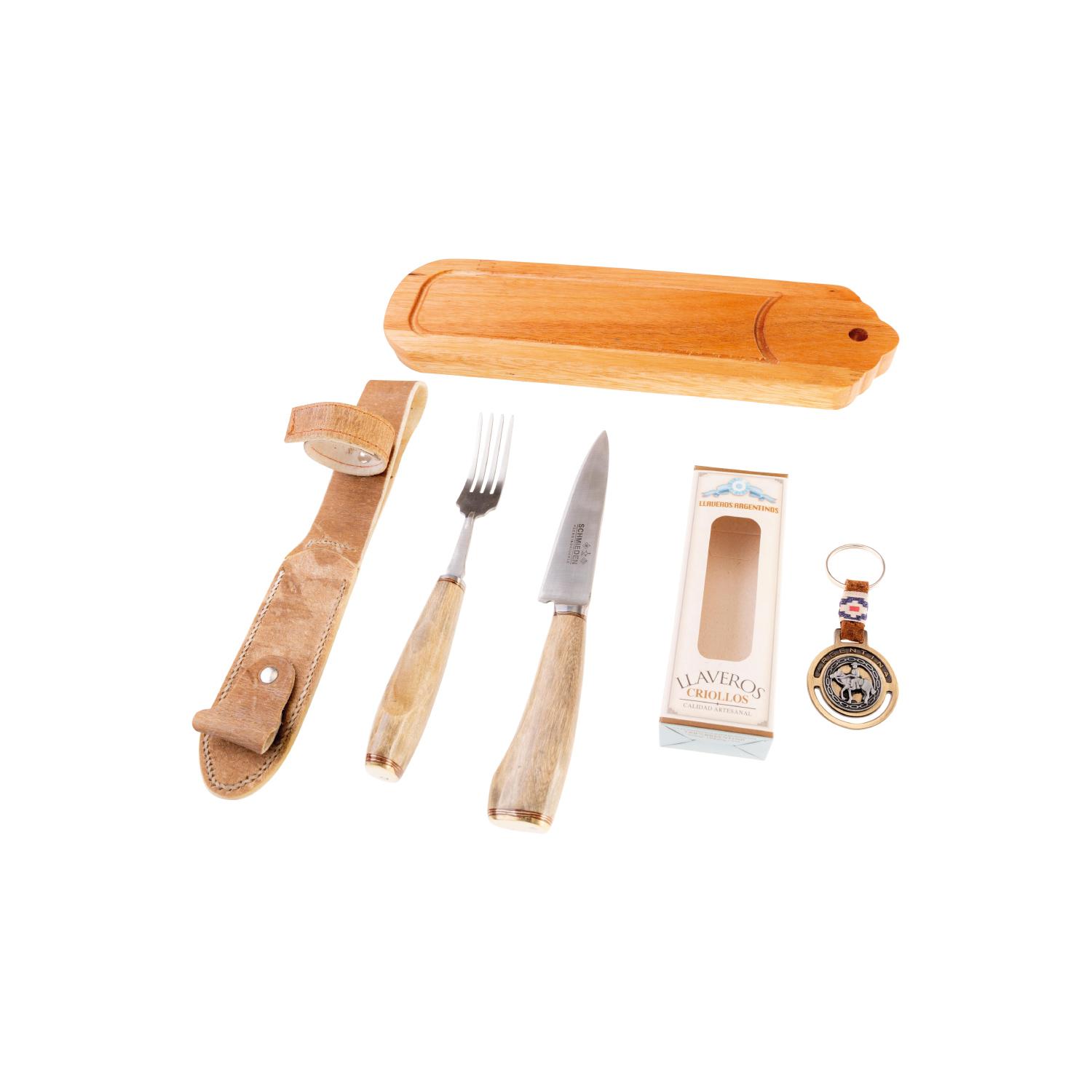 Combo Set De Cubiertos (1 Llavero En Cuero En Caja, 1 Juego De Cuchillo Y Tenedor Inox Encabado En Madera Con Vaina Cuero Crudo , 1 Tabla De Madera Cuenco Grabada 30×8 )