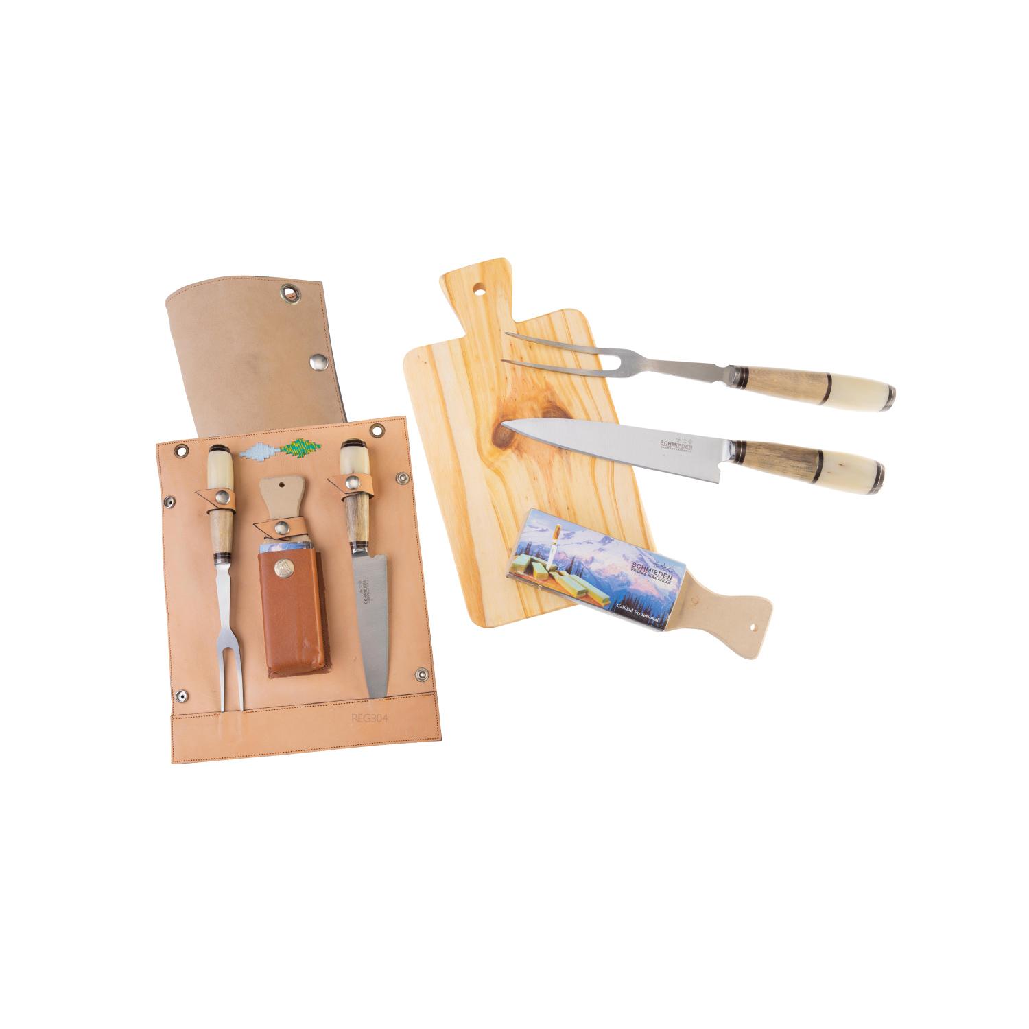 Combo Set Quincho (1 Tablita Estilo Clasico 32×17, 1 Juego Cuchillo,Tenedor y Piedra De Afilar Acero Inox. 18 Cm Encabados En Maderas, Hueso Con Estuche De Cuero.)