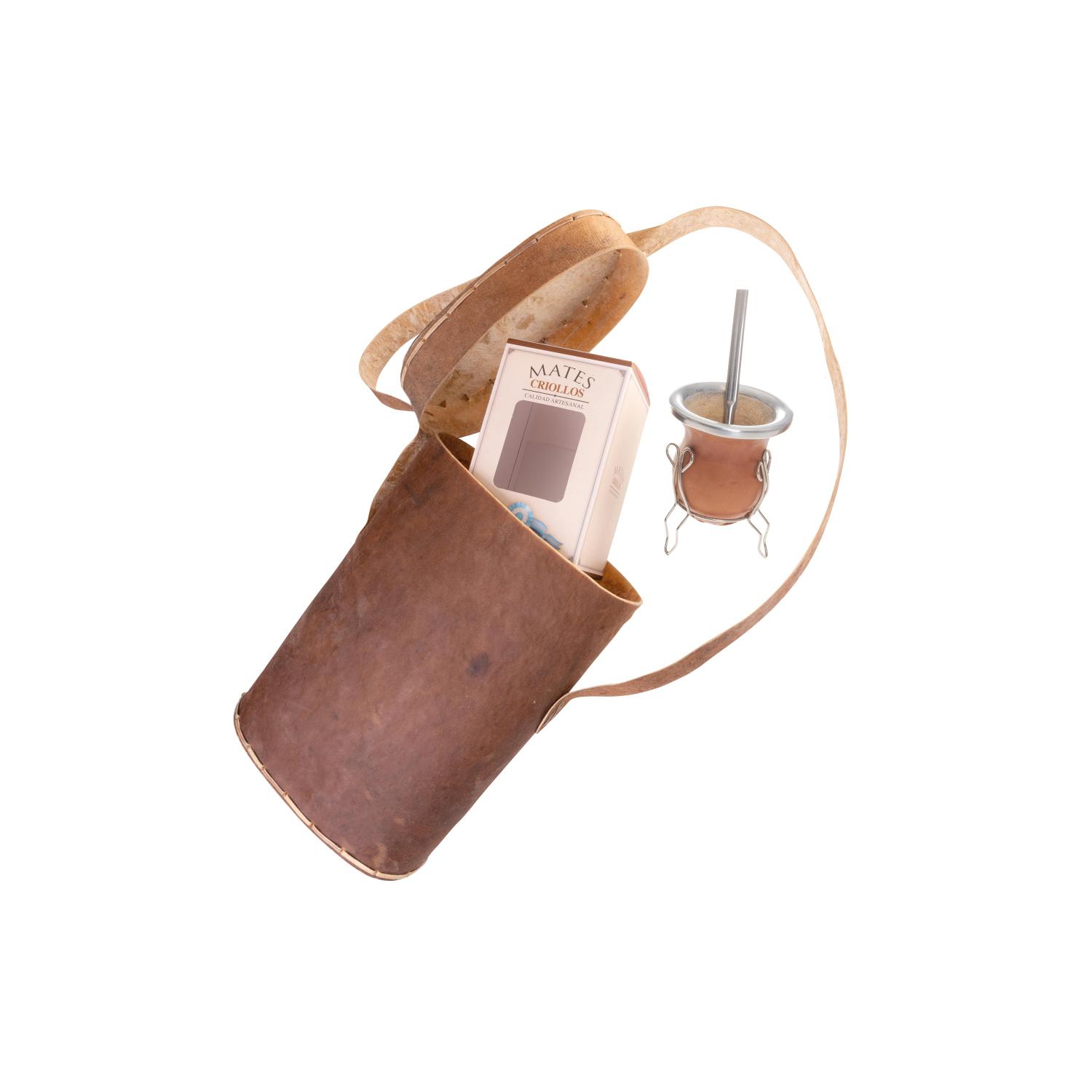 Combo Termera De Cuero(1 Mate De Calabaza Forrado Vaqueta Bombilla Acero Inox Plana Grabado C/Caja,1 Porta Termo Rustico Rigido en Cuero Crudo)