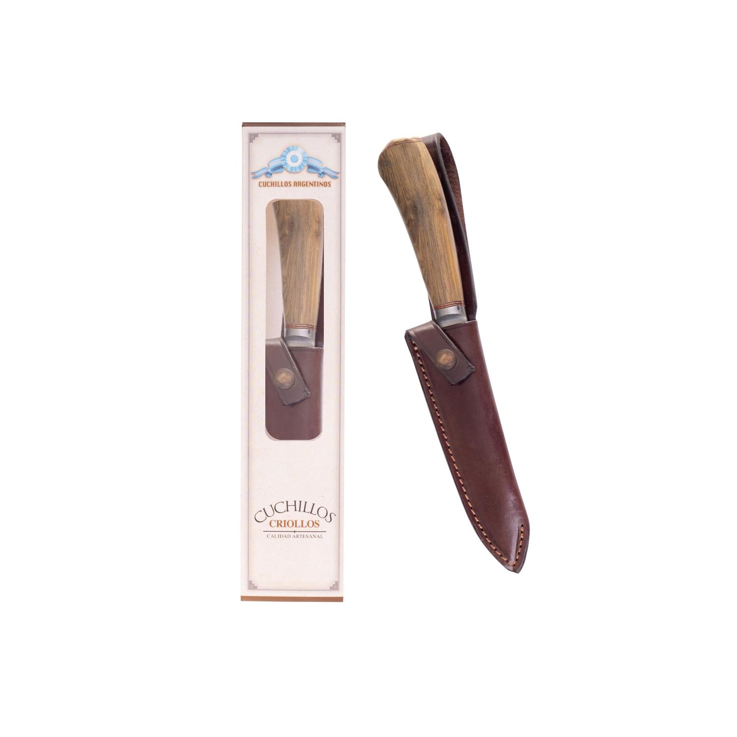 Cuchillo Hoja Acero Inox. Schmieden 14 Cm Encabado En Madera Con Vaina De Cuero Vaqueta Fina Tipo Monte (CUC005) Grabado C/Caja