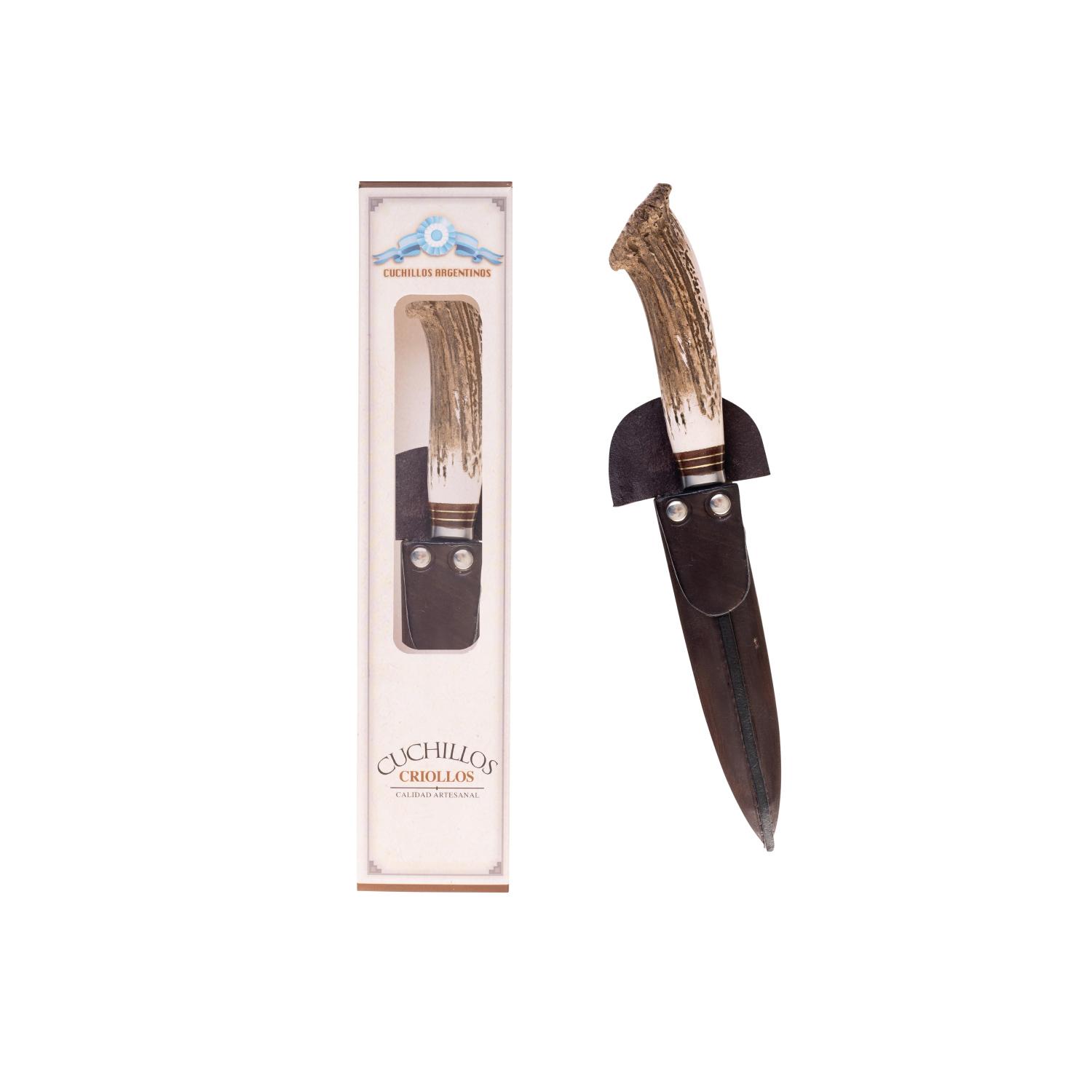 Cuchillo Hoja Acero Inox. Schmieden 14 Cm Encabado En Simil Asta Ciervo Vaina De Cuero (CUC176) Grabado C/Caja