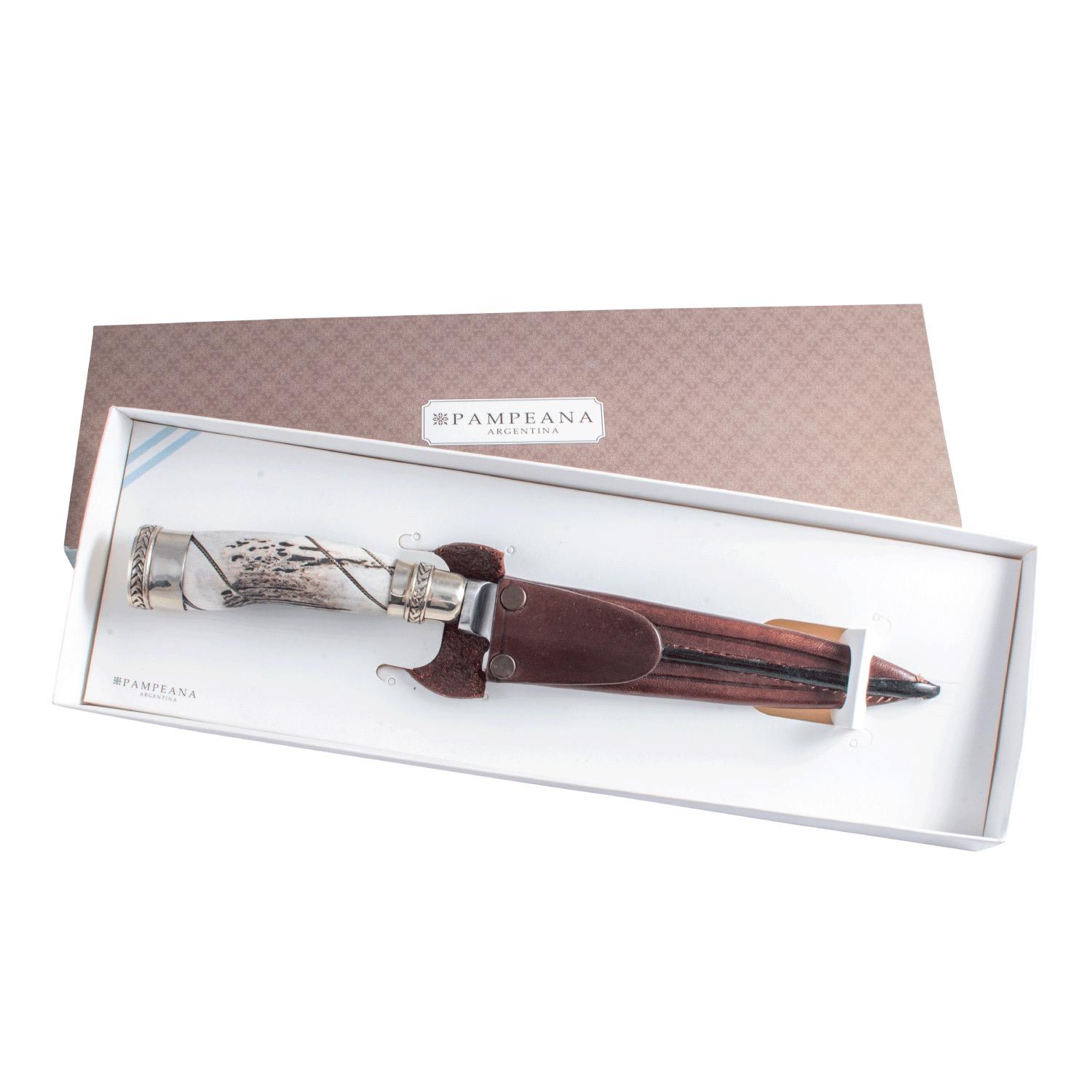 Cuchillo 14cm Inox.Pampeana Encabado En Ciervo Con Alambre Y Virola De Alpaca En Vaina De Cuero Con Packaging