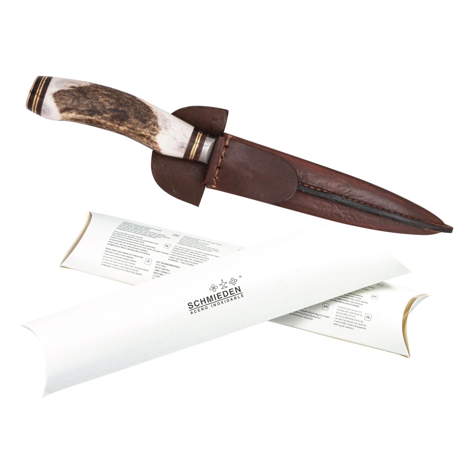 Cuchillo Hoja Acero Inox. Schmieden 14 Cm Encabado En Ciervo Completo y Vaina De Cuero VaquetaCon sobre