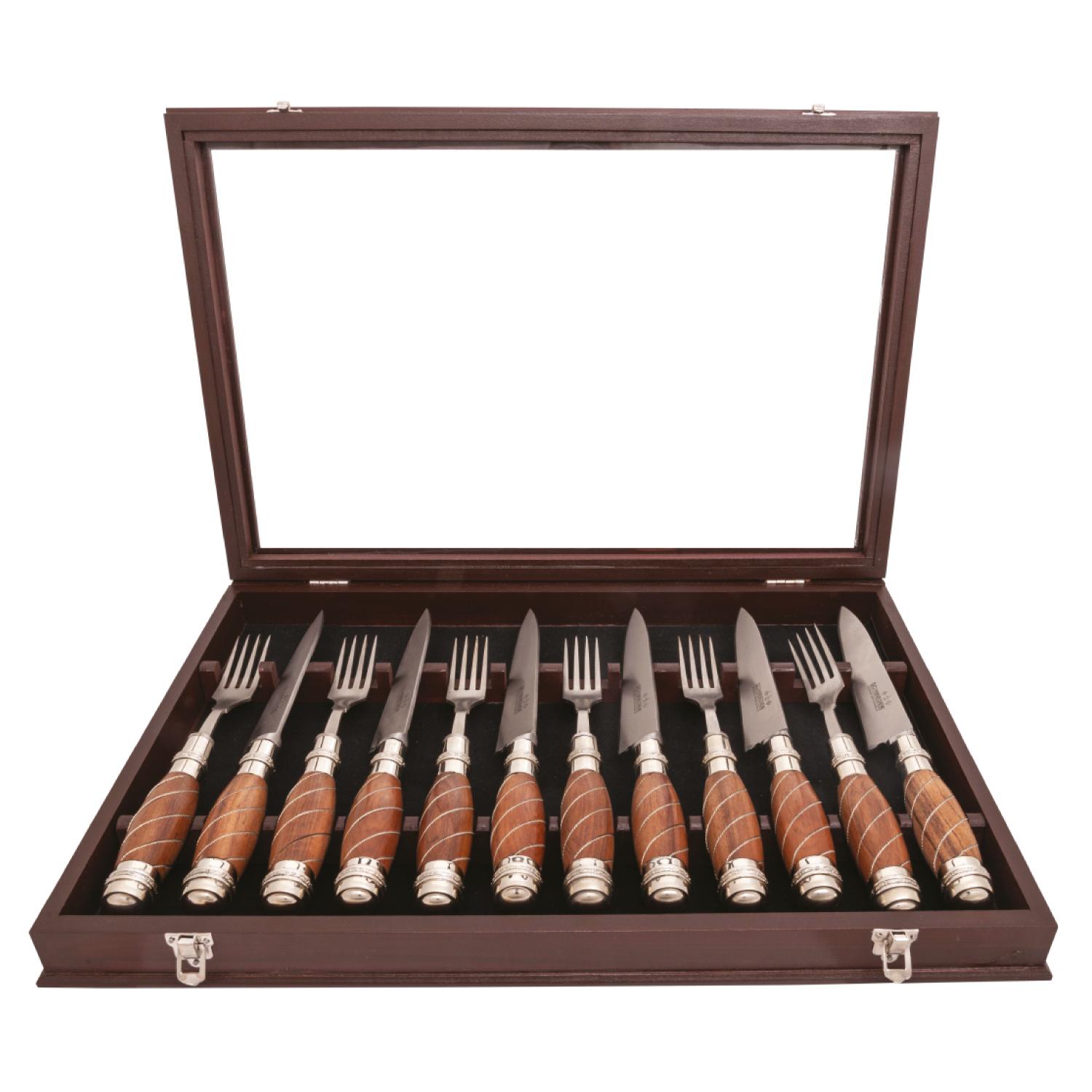 Juego De Tenedores y Cuchillos En Acero Inox. 14 cm Por 12 Unidades, Encabados Madera Con Alambre Y Virolas De Alpaca En Caja Con Visor De Vidrio
