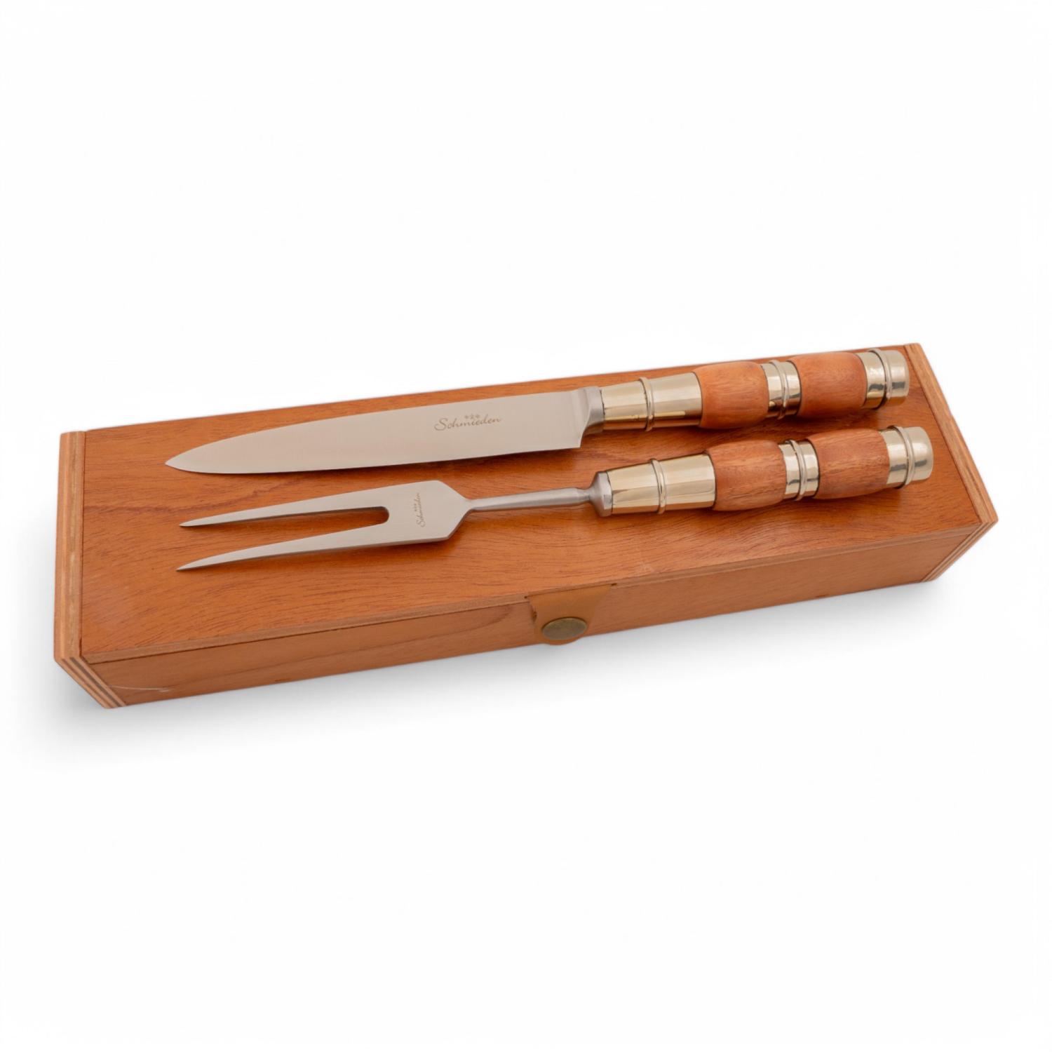 Juego De Cubierto Individual En Madera Y Alpaca 3 Virolas Labrada, Linea Fina, En Caja De Madera Cedro Lustrada, Hoja De 14 cm y Tenedor 2 Dientes En Acero Inoxidable Marca Schmieden Estilo CAMPERO PAMPA