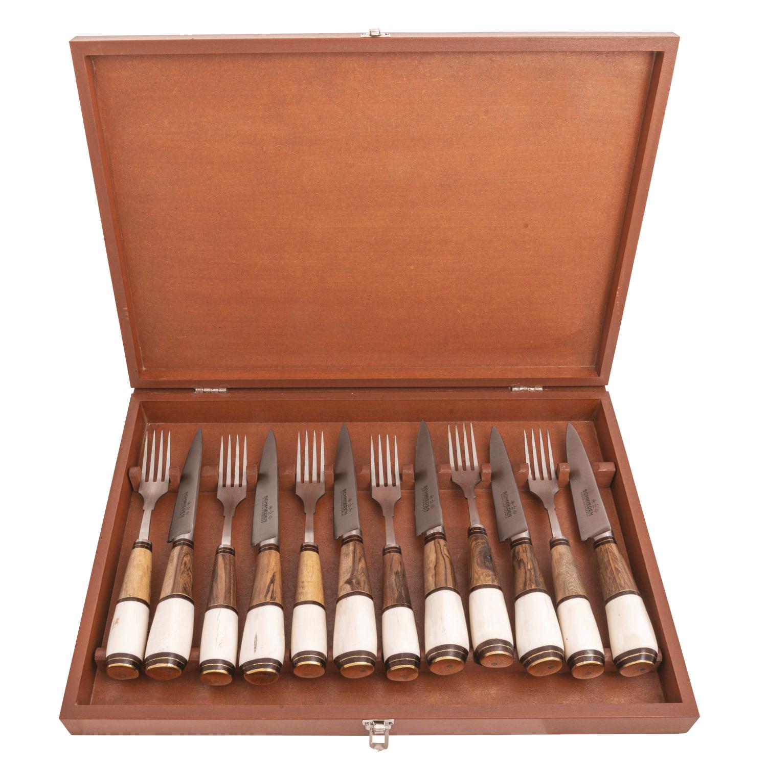 Juego De Tenedores y Cuchillos En Acero Inoxidable 5 pulgadas Por 12 Unidades, Encabados madera y Hueso Con Caja De Madera Claro Eco