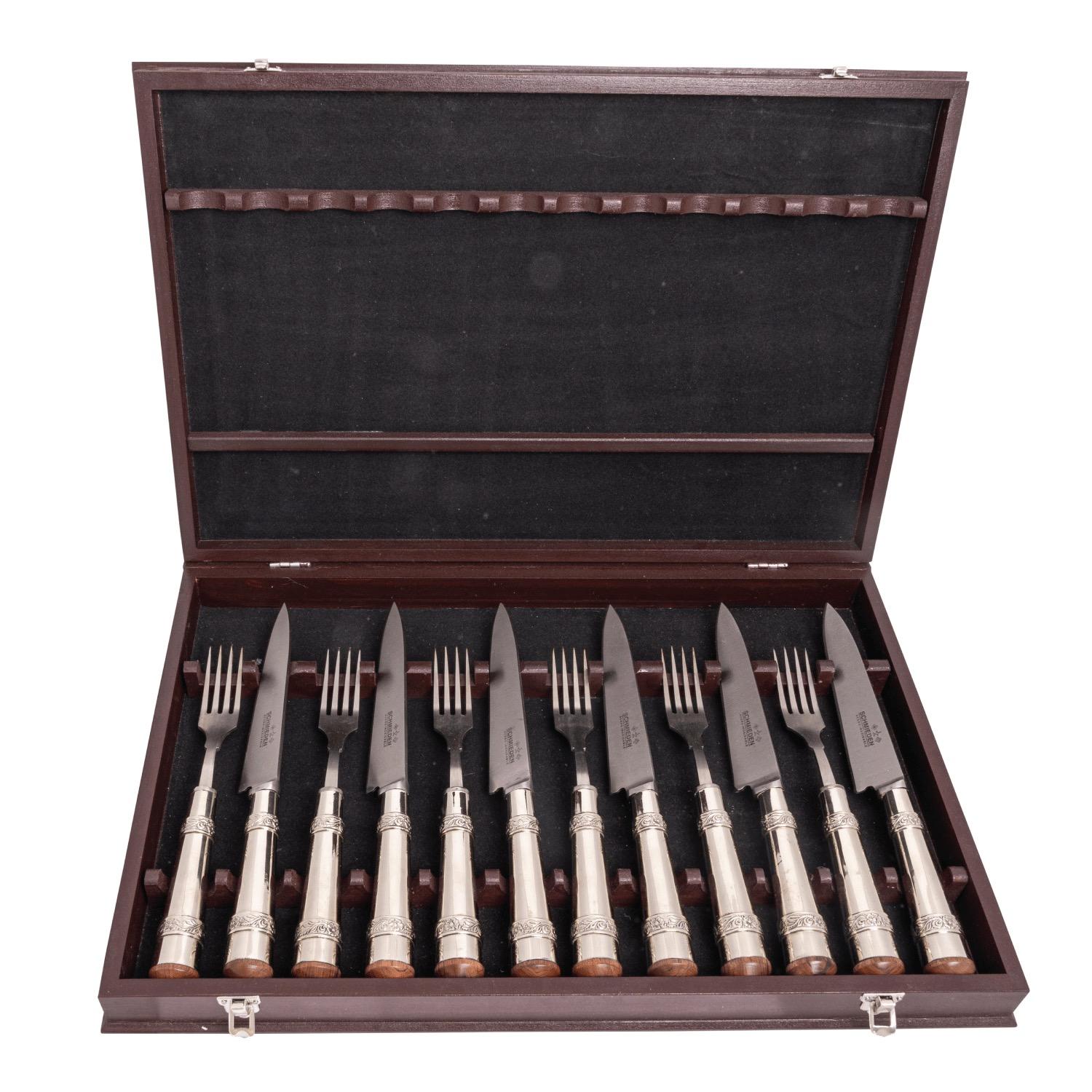 Juego De Tenedores y Cuchillos En Acero Inoxidable 14 cm Por 12 Unidades, Encabados Alpaca Con Detalles En Madera Con Caja De Madera Forrada En Pana