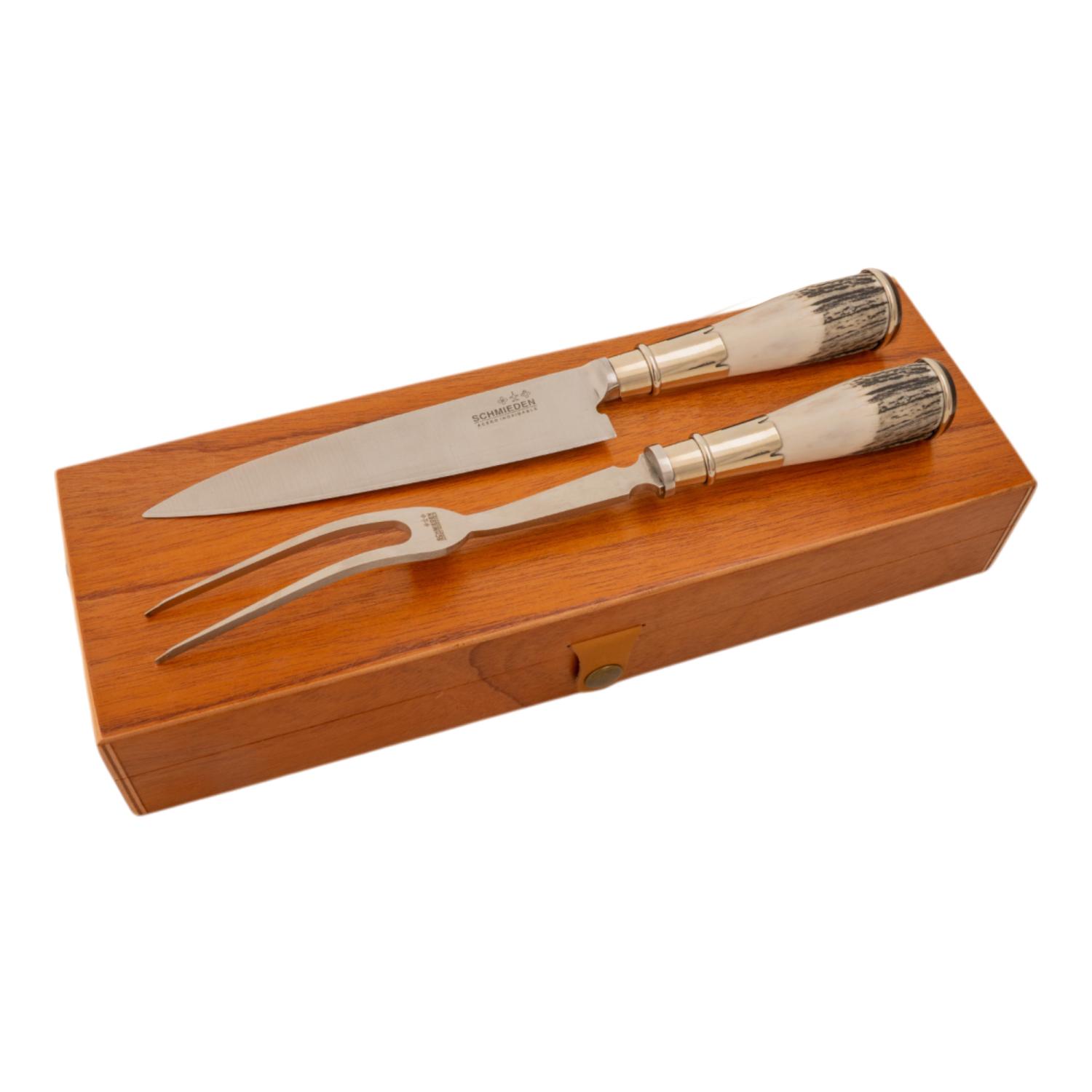 Juego De Cubiertos Individual Cuchillo Y Tenedor 18 Cm Ciervo Y Alpaca Marca Schmieden En Caja Madera Fina Cedro Lustrado