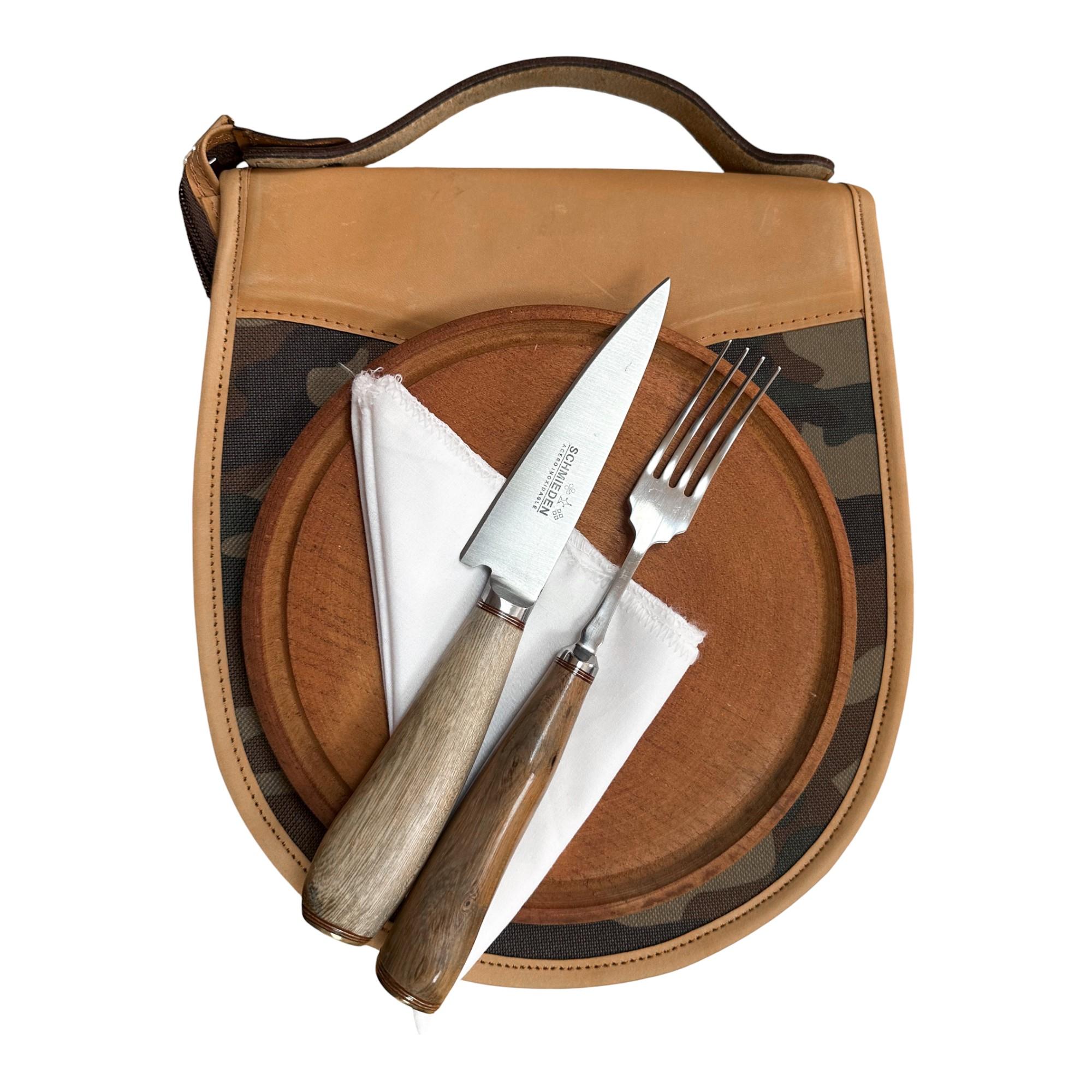 Juego de Pic-Nic Individual SCHMIEDEN de acero inoxidable con cuchillo y tenedor regional de madera y Estuche Camuflado con cuero Premium