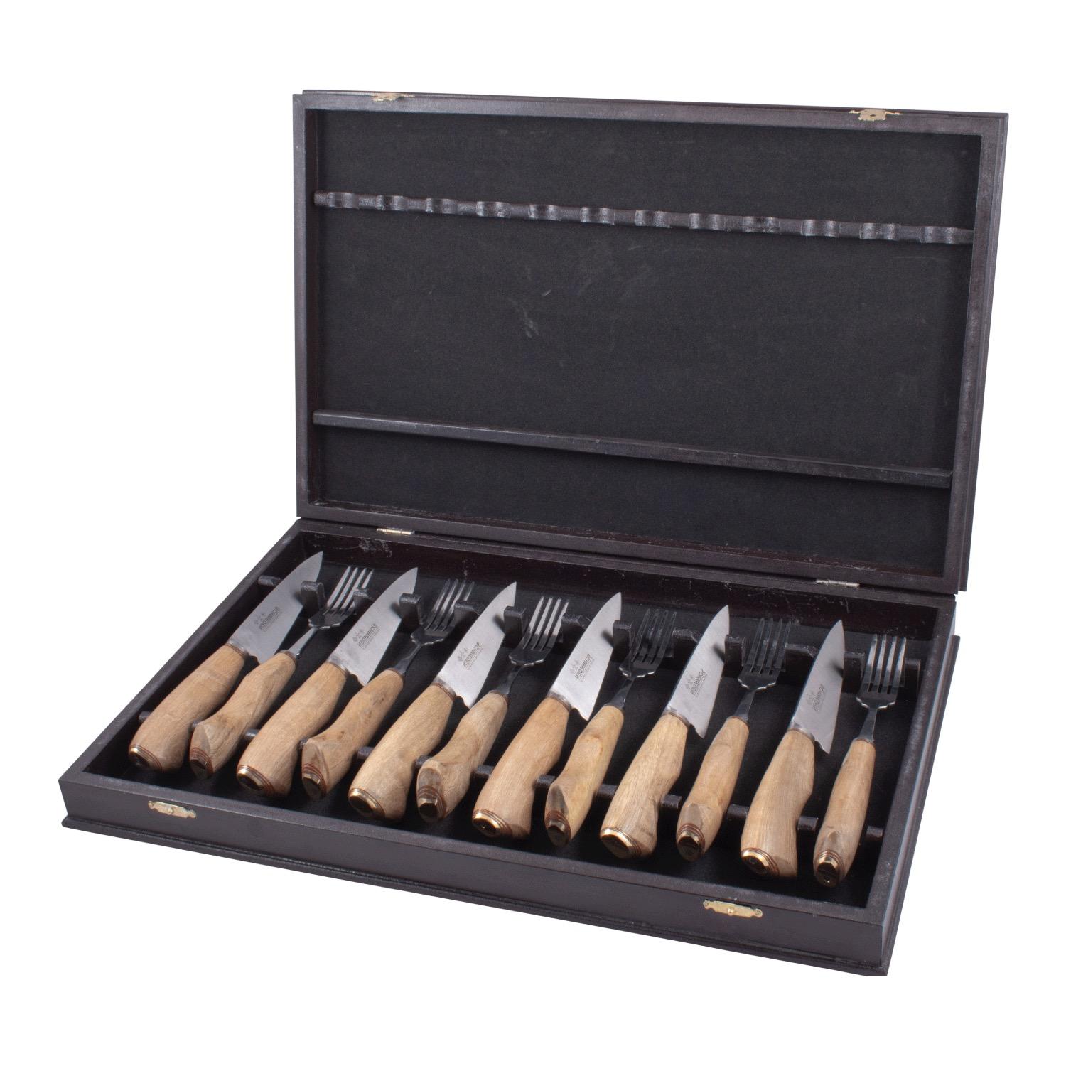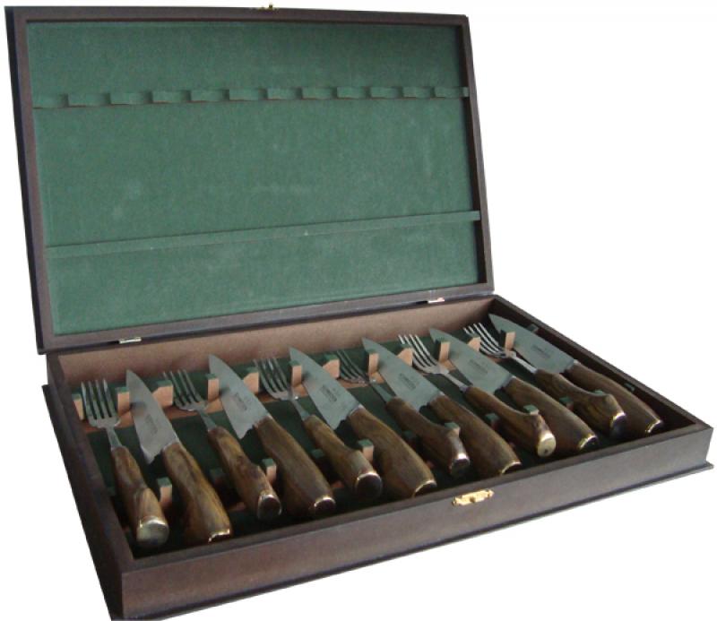 Juego De Tenedores y Cuchillos En Acero Inoxidable 5″ Por 12 Unidades, Encabados En Madera Y Caja De Madera Forrada En Pana
