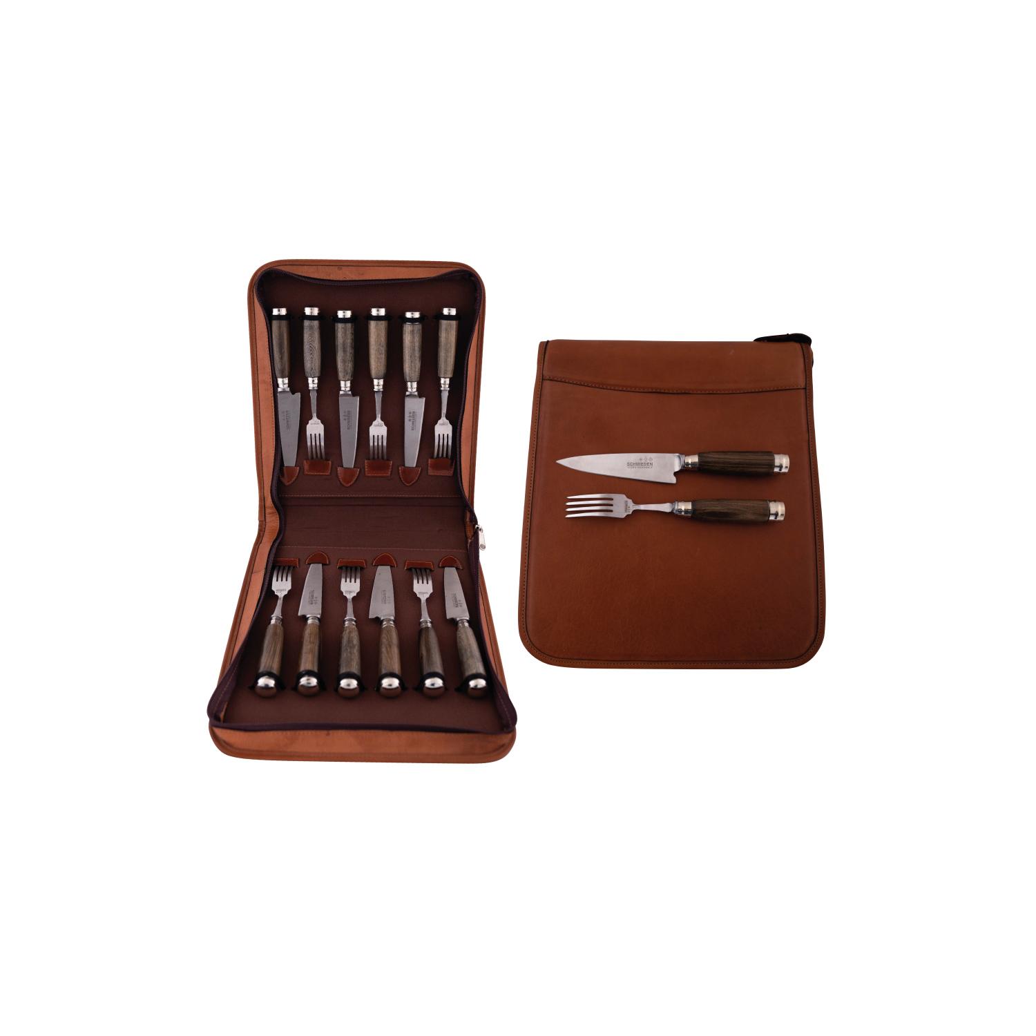 Juego De Tenedores y Cuchillos En Acero Inoxidable Por 12 Unidades, Encabados Madera Con Alpaca Con Estuche En Cuero