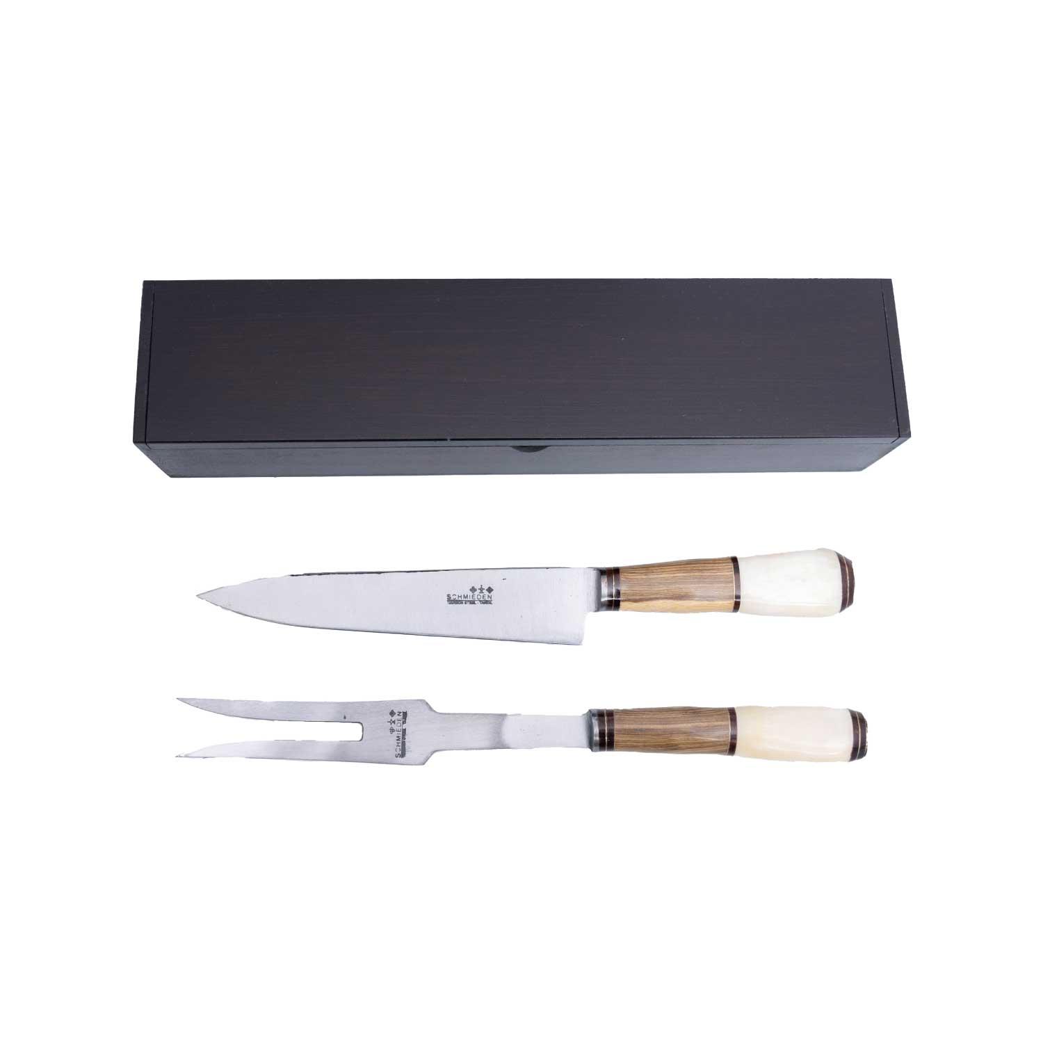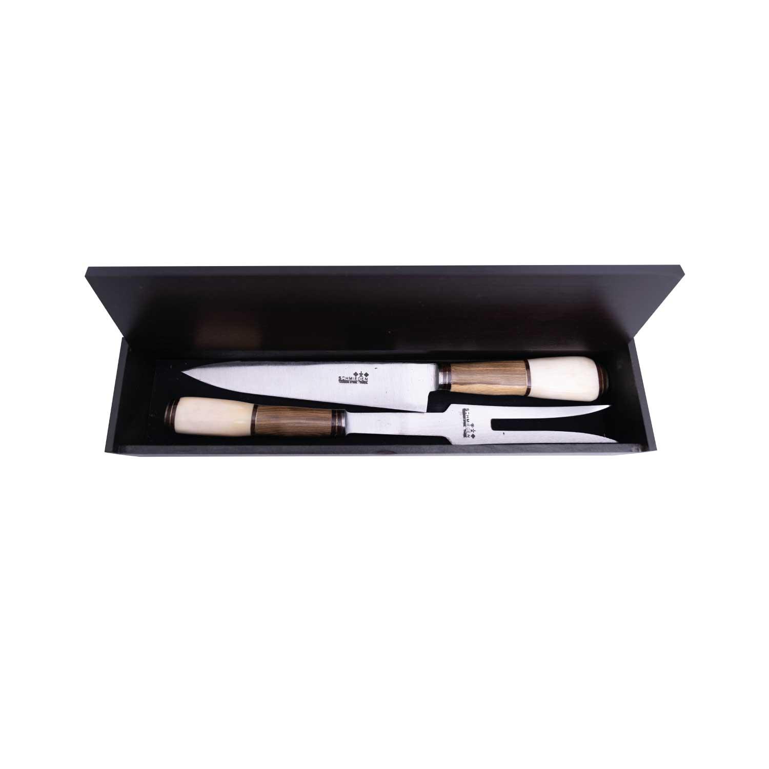 Juego Para Asado De Cuchillo y Tenedor De Trinchar Acero Carbono Schmieden 18 Cm Encabados En Madera, Ciervo o Materiales Ecológicos Con Caja