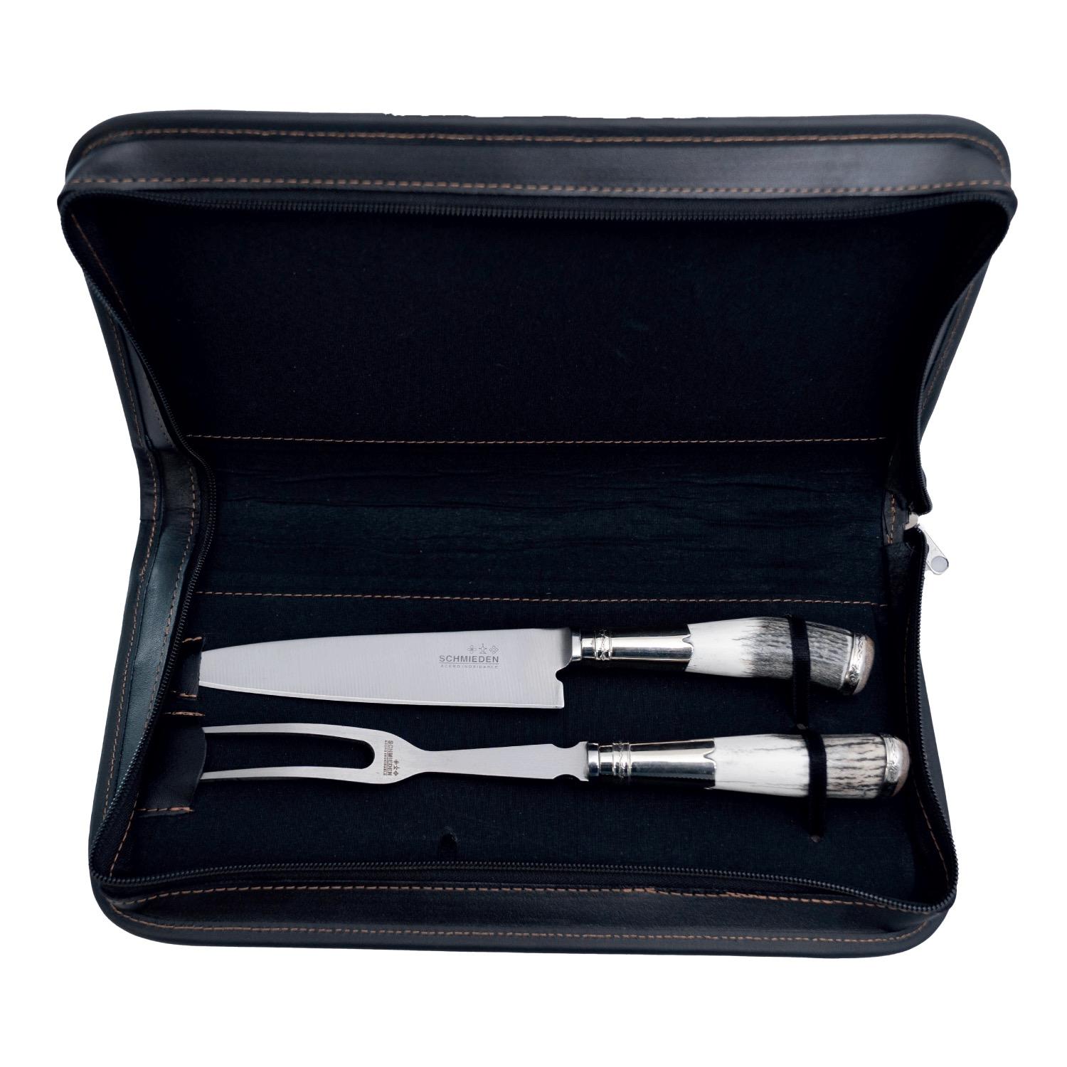 Juego Para Asado Cuchillo y Tenedor De Trinchar Acero Inox Schmieden 18 Cm Encabados En Ciervo Con Alpaca En Estuche En Cuero, Largo Total 28 Cm