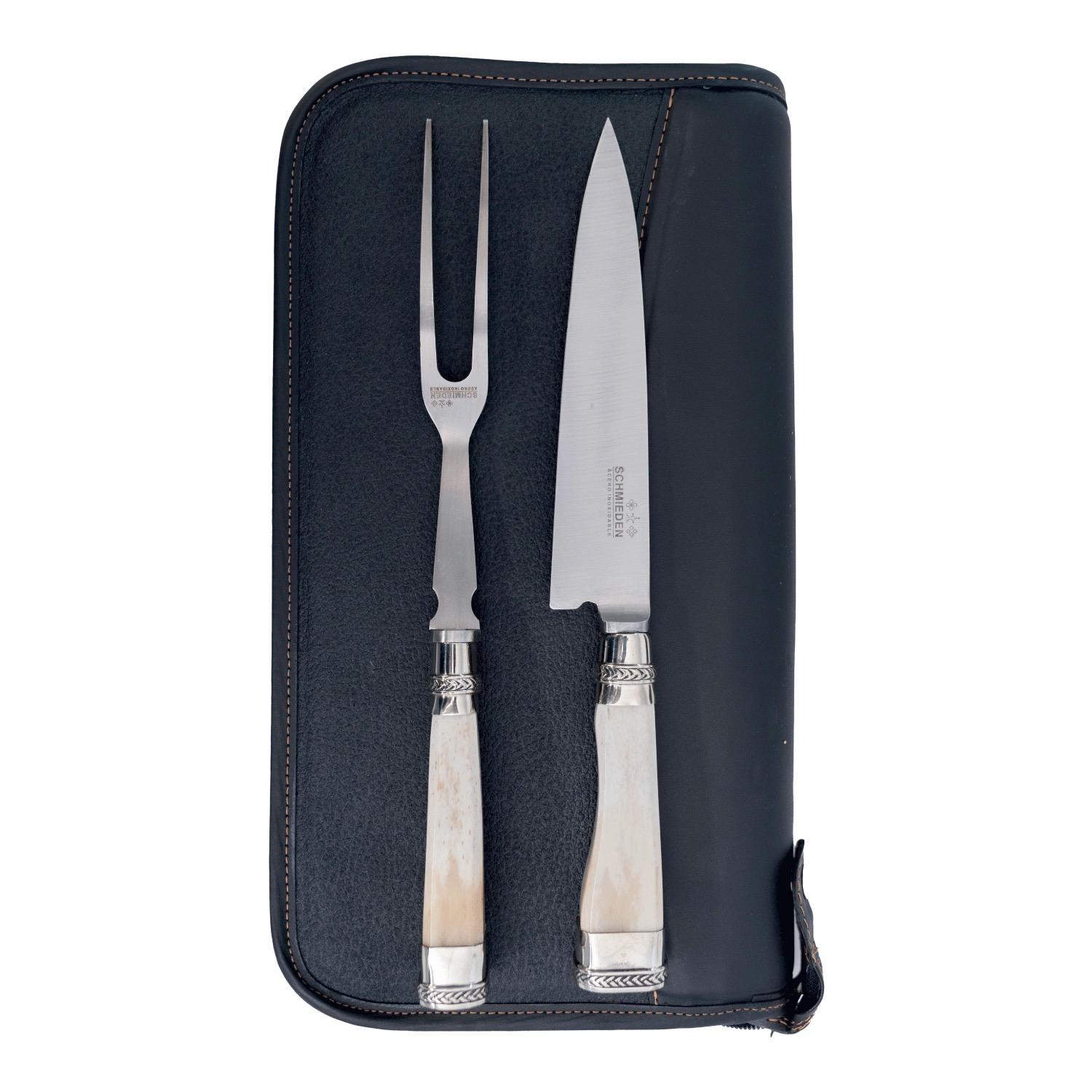 Juego Para Asado Cuchillo y Tenedor De Trinchar Acero Inox Schmieden 18 Cm Encabados En Hueso Con alpaca en Estuche En Cuero, Largo Total 28 Cm