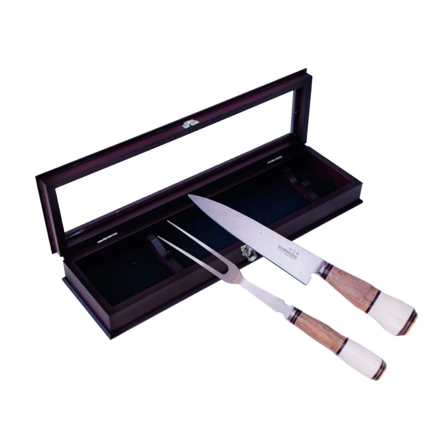 Juego Para Asado Cuchillo y Tenedor De Trinchar Acero Inox Schmieden 18 Cm Encabados en Madera Y Hueso Con Caja Y Visor De Vidrio, Largo Total 28 Cm