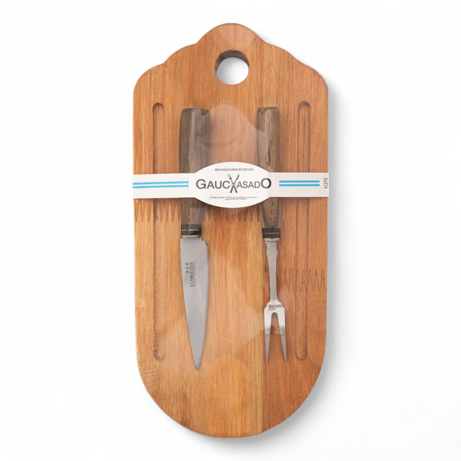 Kit Ideal Para Regalar De Tabla Y Cuchillo, Tabla de Madera Con Canaleta Medidas Aprox. 26 x 12 Cm, Cuchillos Y Tenedor De Acero Inox. 8 cm Cabo Madera linea SCHMIEDEN, Cerrado Al Vacio Gauchasado
