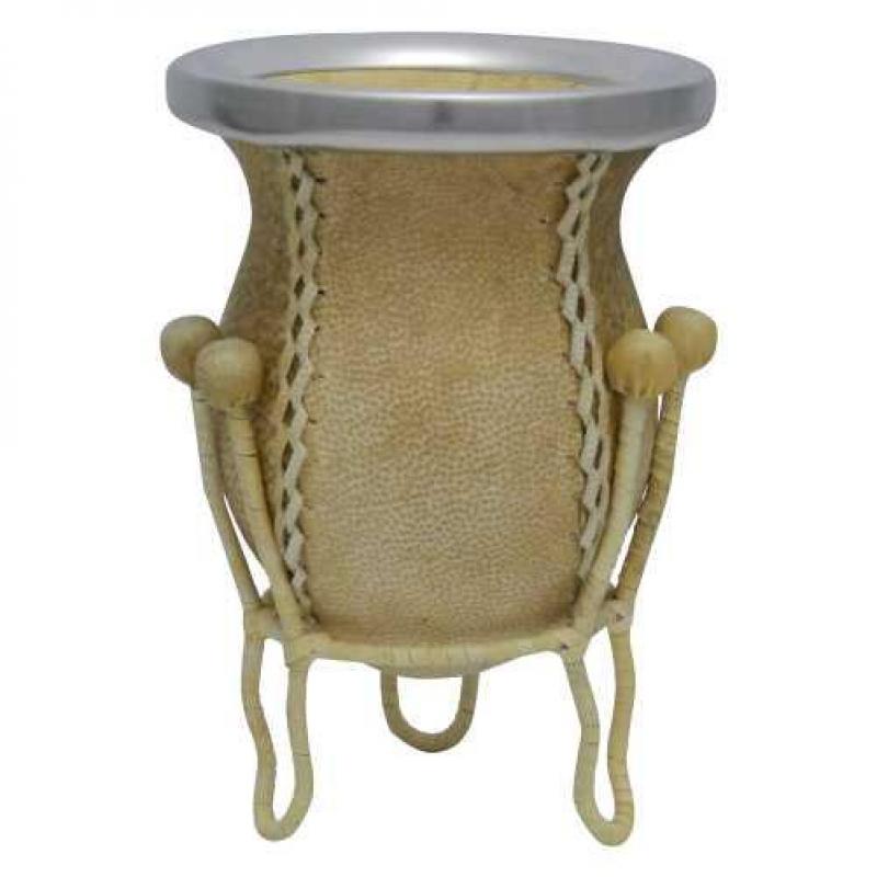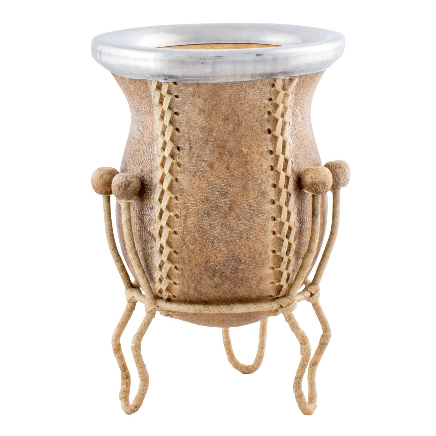 Mate Vuelo De Calabaza Recubierto En Cuero Crudo Tejido En Tiento Con Posa Forrado
