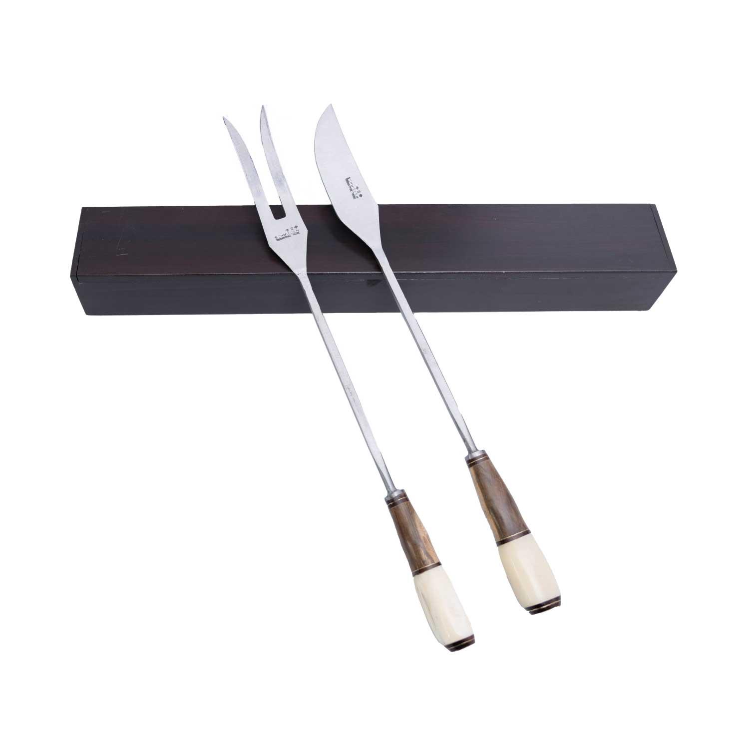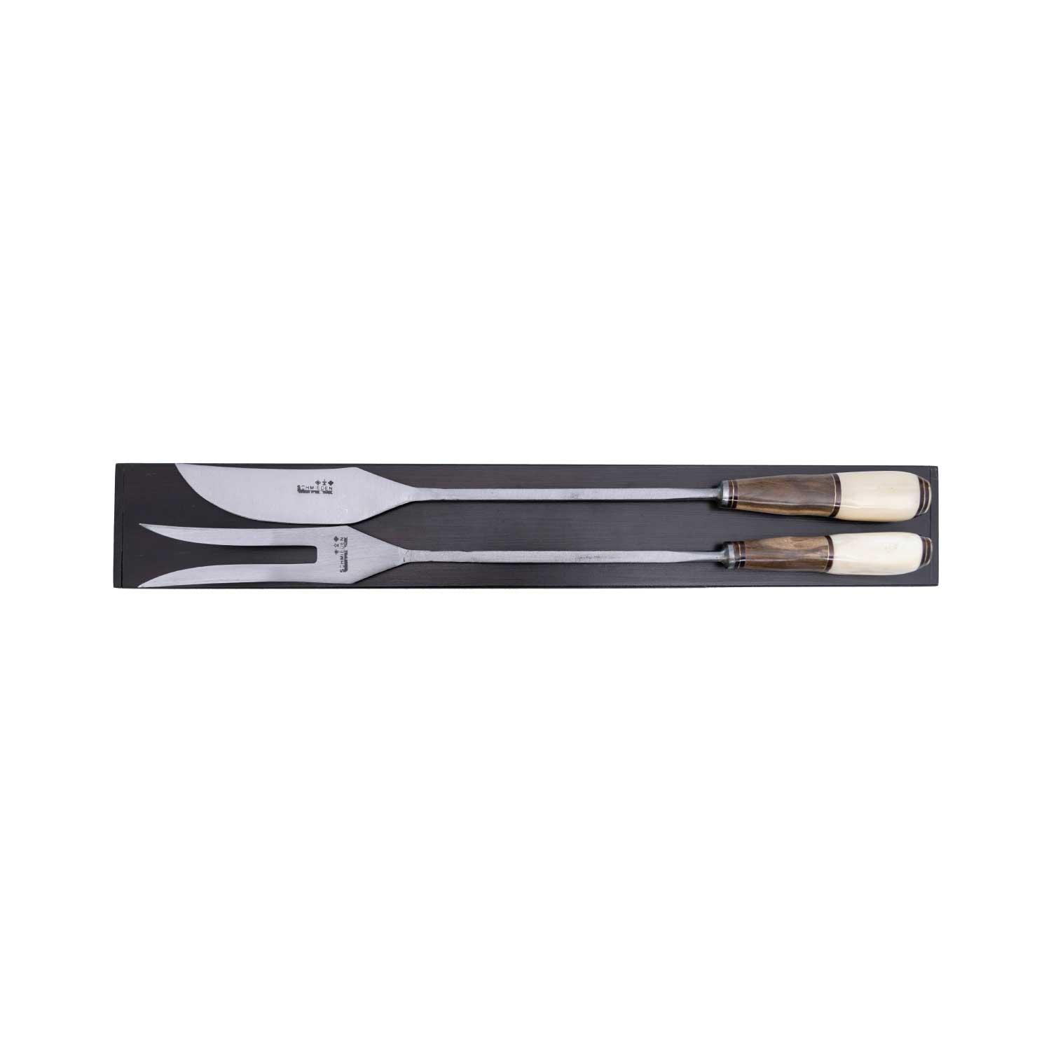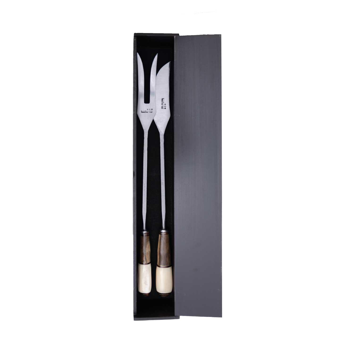 Juego Parrillero Regional Cuchillo Y Tenedor Hoja de Acero Carbono Schmieden 30 Cm Encabado Con Madera y Ciervo y Caja, Largo Total 42 Cm
