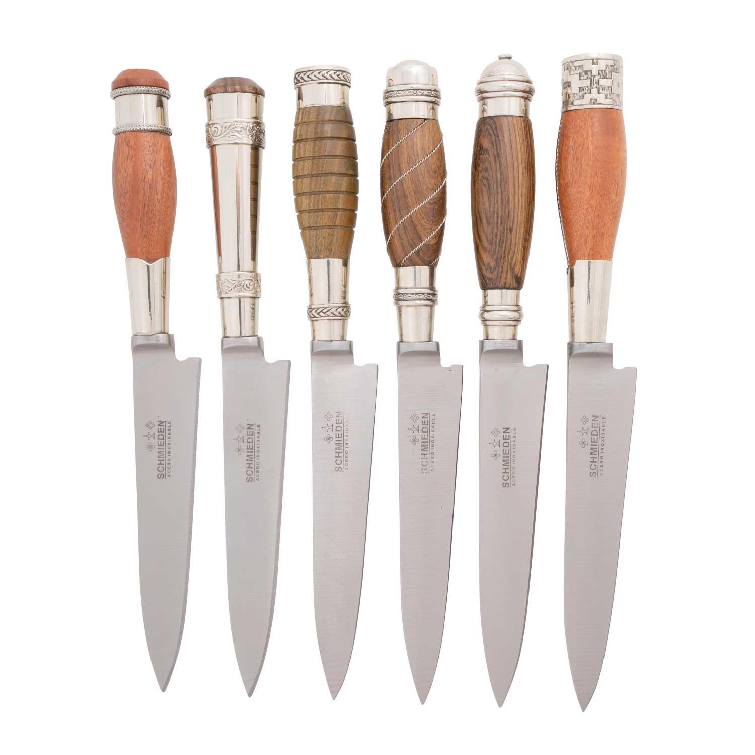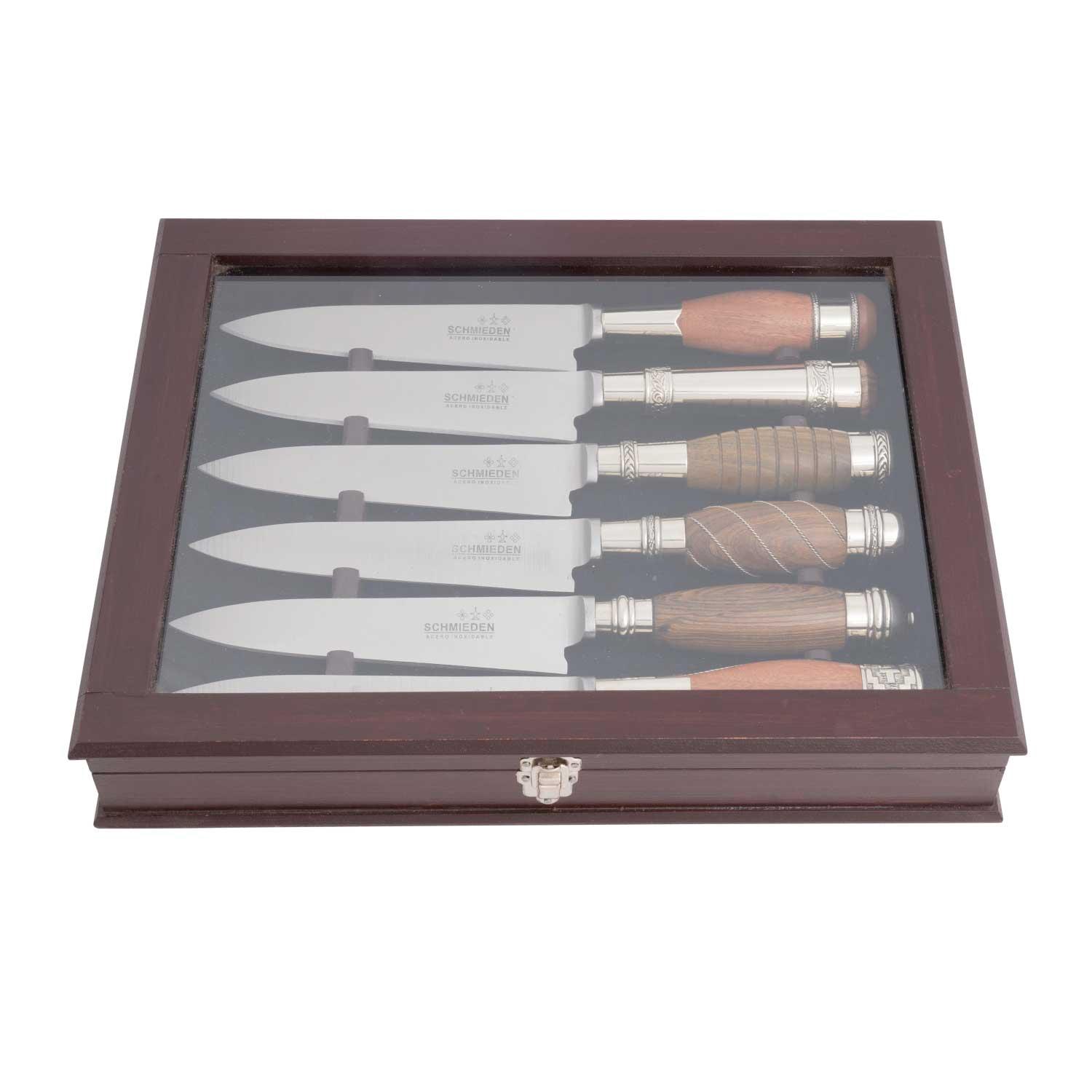 Juego De 6 Cuchillos En Madera Y Diversos Trabajos En Alpaca Con Caja de Madera y Tapa de Vidrio