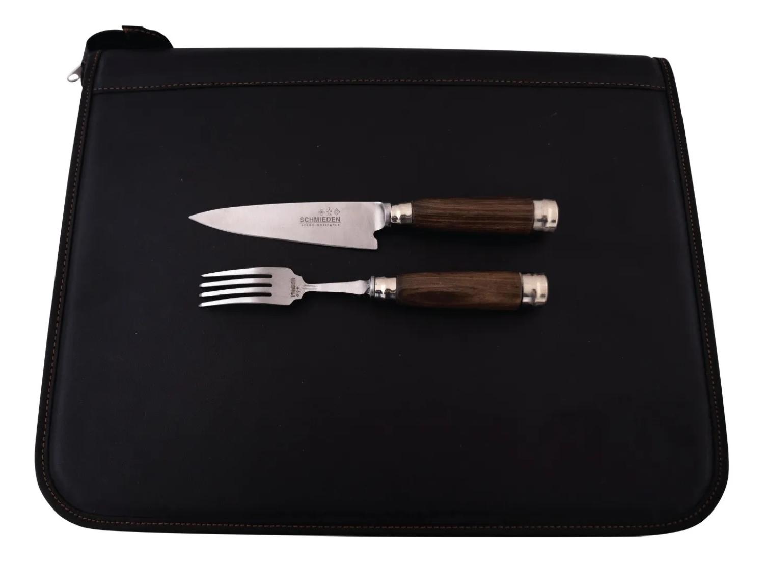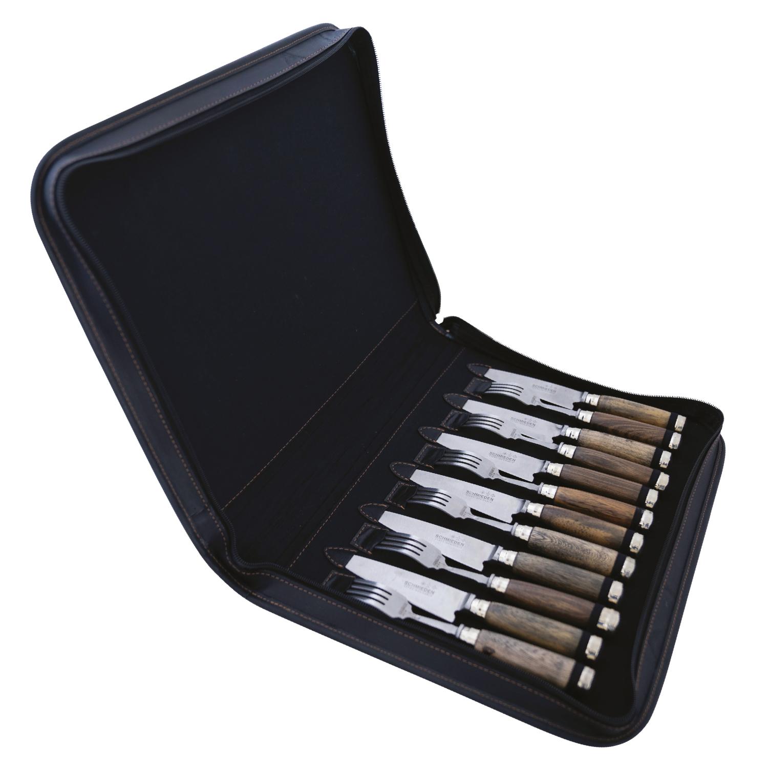 Juego De Tenedores y Cuchillos En Acero Inoxidable Por 12 Unidades, Encabado en Madera y Alpaca Con Estuche En Cuero