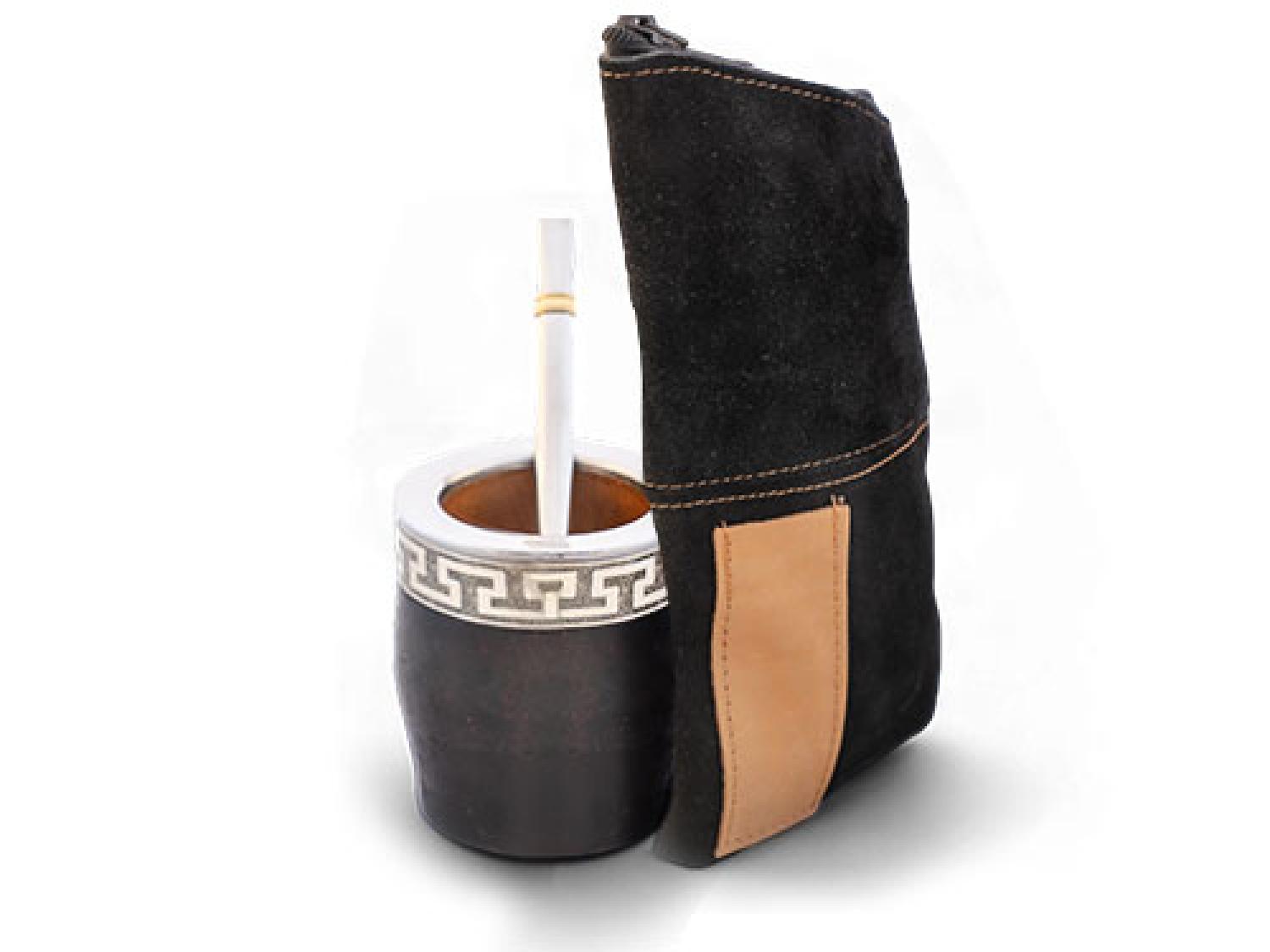 Set De Mates Imperial De Madera Virola De Alpaca Con Bombilla Chata de Acero Y Yerbera De Cuero